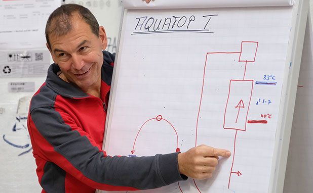 Schlagartig verändert sich die Atmosphäre im Raum. Alle sind konzentriert bei der Sache. Es werden die Inhalte der letzten Schulungen wiederholt, die Techniker tauschen ihre Erfahrungen aus und diskutieren Problemstellungen. Josef unterstützt, indem er sinnvolle Tipps gibt und dazu anregt, nicht nur auswendig gelernte Inhalte abzurufen, sondern sich immer wieder Problemlösungen selbst herzuleiten. Denn keine Wärmepumpe ist wie die andere. So vergehen die ersten beiden Stunden wie im Flug.